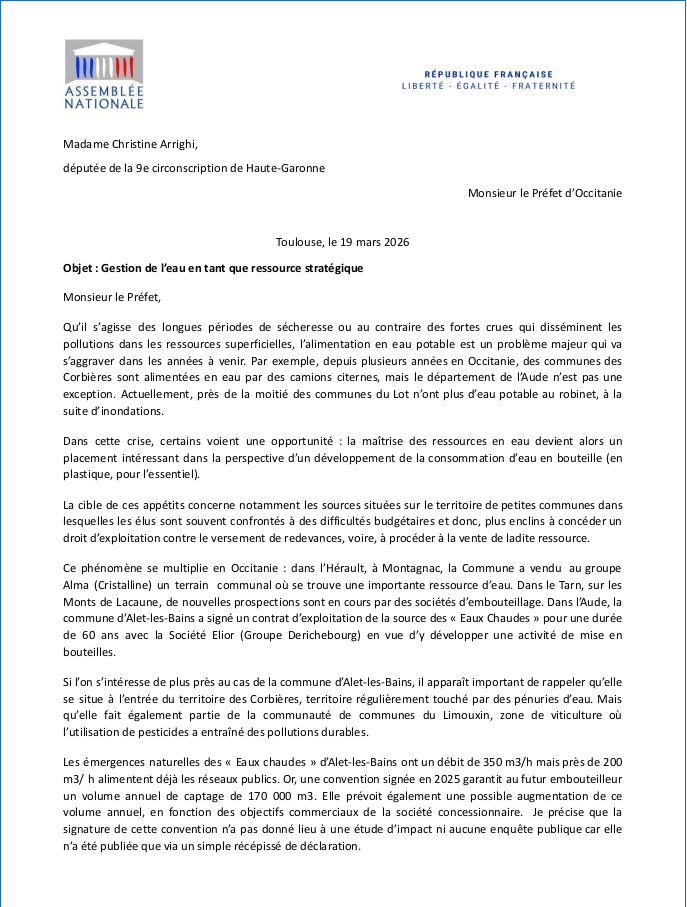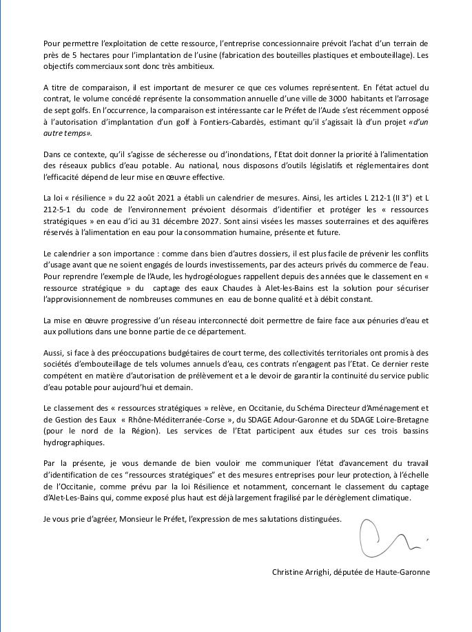 GESTION DE L’EAU Courrier de Mme Arrighi à M. le Préfet