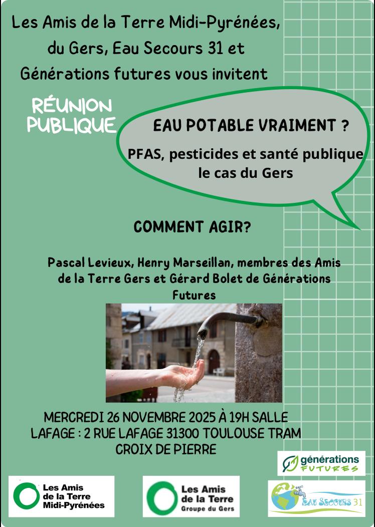 POUR ALLER PLUS LOIN : AMISDELATERRE.GERS@GMAIL.COM; MIDIPYRENEES@AMISDELATERRE.ORG CONTACT@EAUSECOURS31.FR; TOULOUSE@GENERATIONS-FUTURES.FR